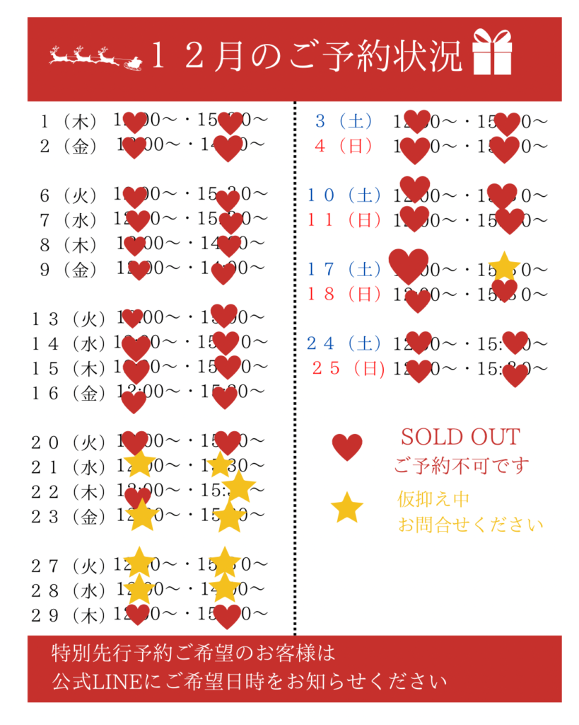 「12月に入らないと予定がわからない。。」という方は是非お気軽にラインにてご一報くださいませ